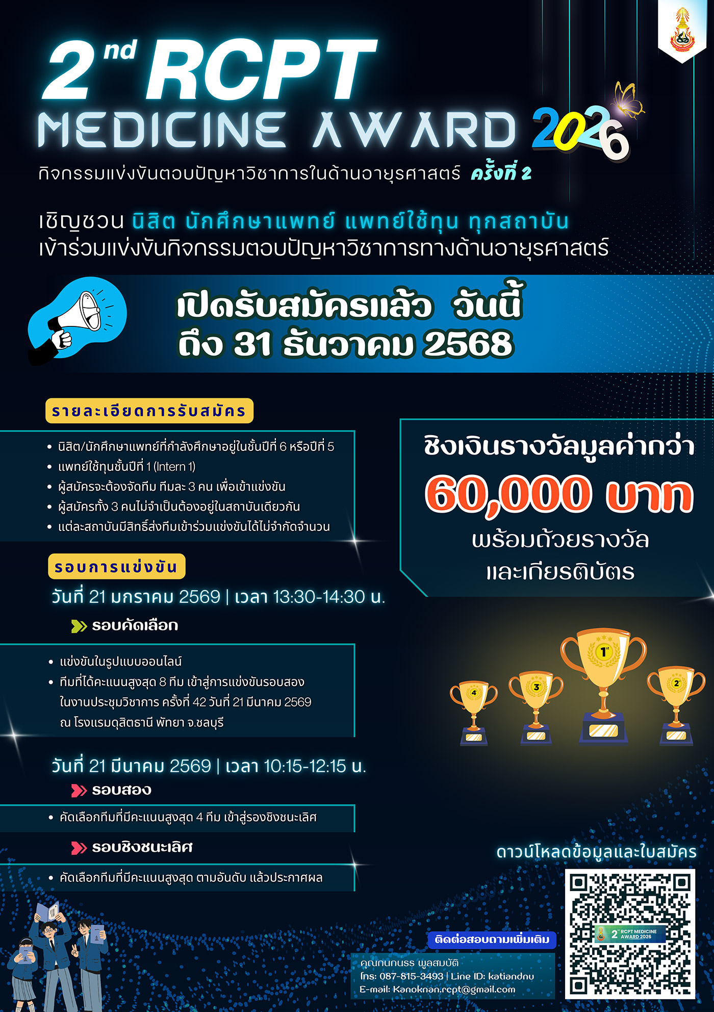 ราชวิทยาลัยอายุรแพทย์แห่งประเทศไทย ขอเชิญชวนนิสิต นักศึกษาแพทย์ และแพทย์ใช้ทุนปีที่ 1 (Intern 1) จากสถาบันทั่วประเทศ สมัครเข้าร่วมการแข่งขันตอบปัญหาทางวิชาการด้านอายุรแพทย์ เพื่อส่งเสริมการเรียนรู้ การแลกเปลี่ยนความรู้ และพัฒนาทักษะทางด้านอายุรศาสตร์เพิ่มมากขึ้น