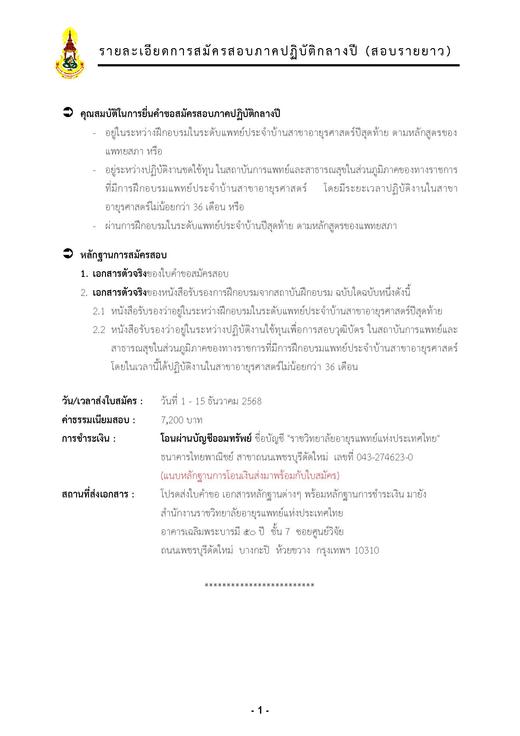 ราชวิทยาลัยอายุรแพทย์แห่งประเทศไทย กำหนดให้มีการยื่นคำขอสมัครสอบภาคปฏิบัติกลางปี (สอบรายยาว) เพื่อการสอบวุฒิบัตรฯ สาขาอายุรศาสตร์ ประจำปีการฝึกอบรม 2568 สำหรับแพทย์ประจำบ้านปีที่ 3 ระหว่างวันที่ 1 - 15 ธันวาคม 2568 โดยมีรายละเอียด/ขั้นตอนดังนี้