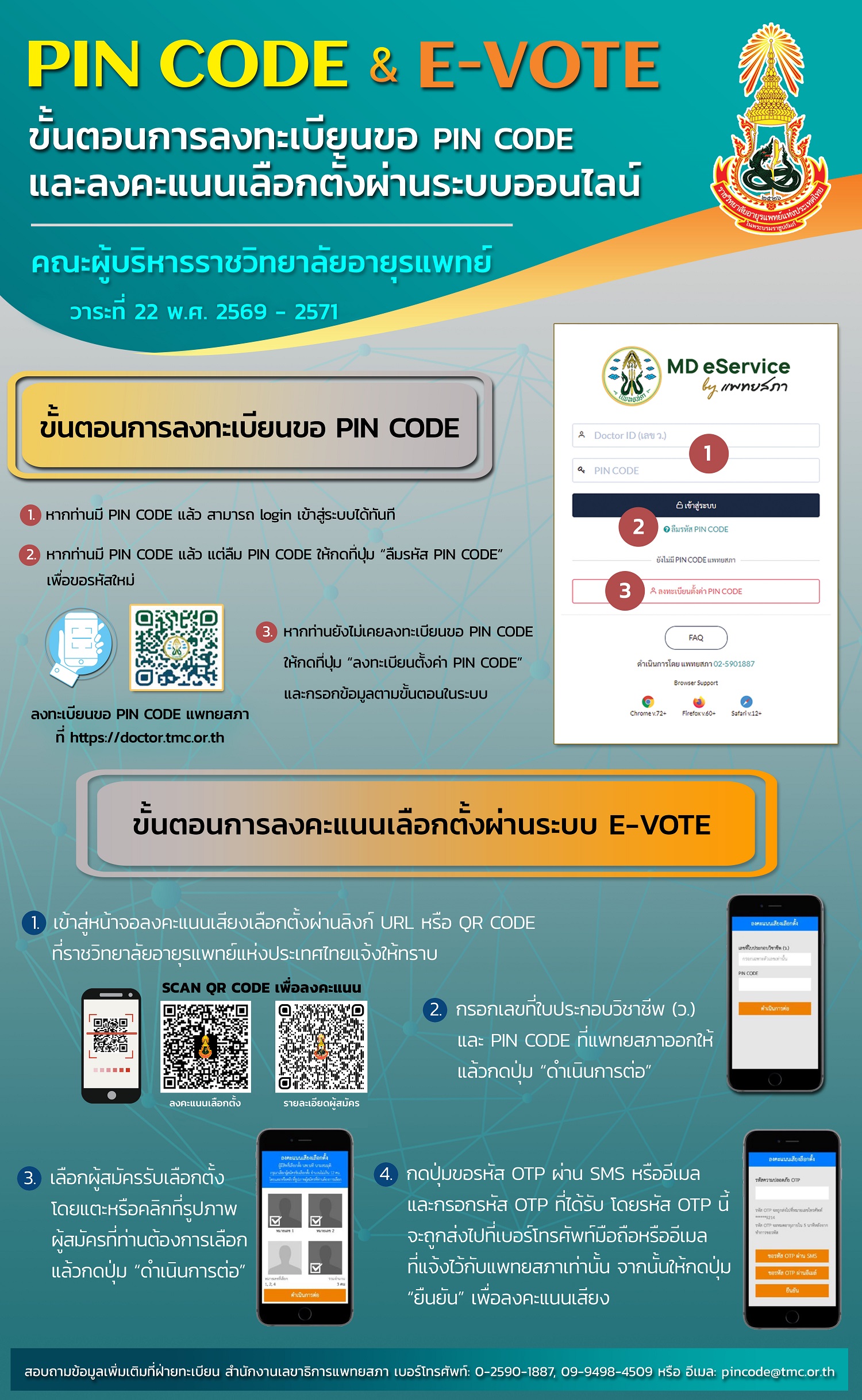 สอบถามเรื่อง PIN CODE เพิ่มเติมได้ที่ฝ่ายทะเบียน สำนักงานเลขาธิการแพทยสภา: