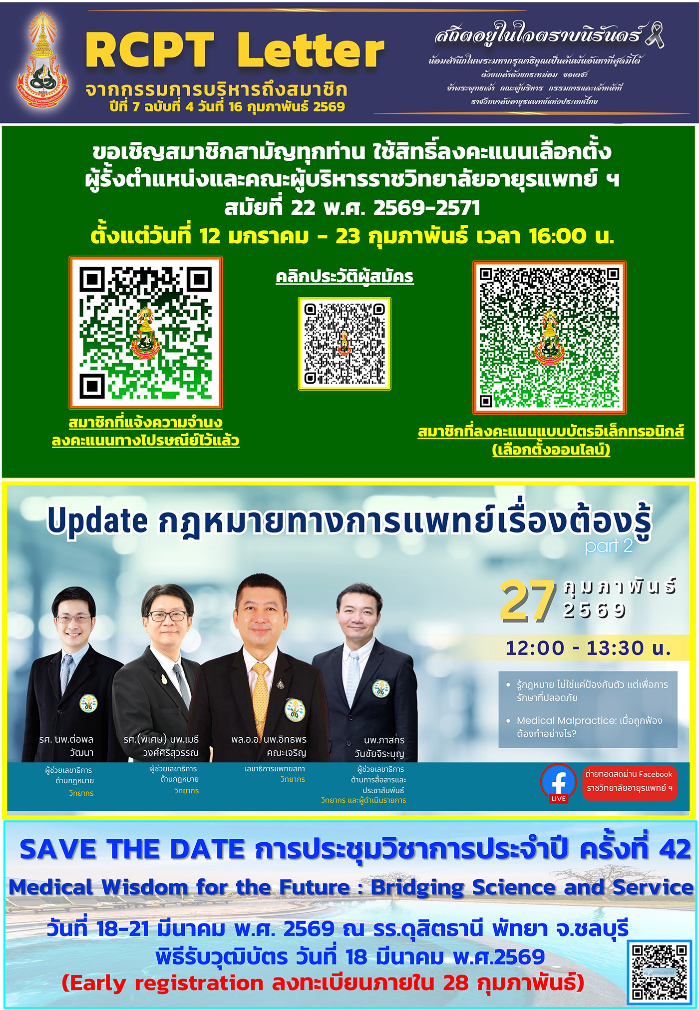 ขอเชิญสมาชิกสามัญทุกท่าน ใช้สิทธิ์ลงคะแนนเลือกตั้งผู้รั้งตำแหน่งประธาน และคณะผู้บริหารราชวิทยาลัย ฯ