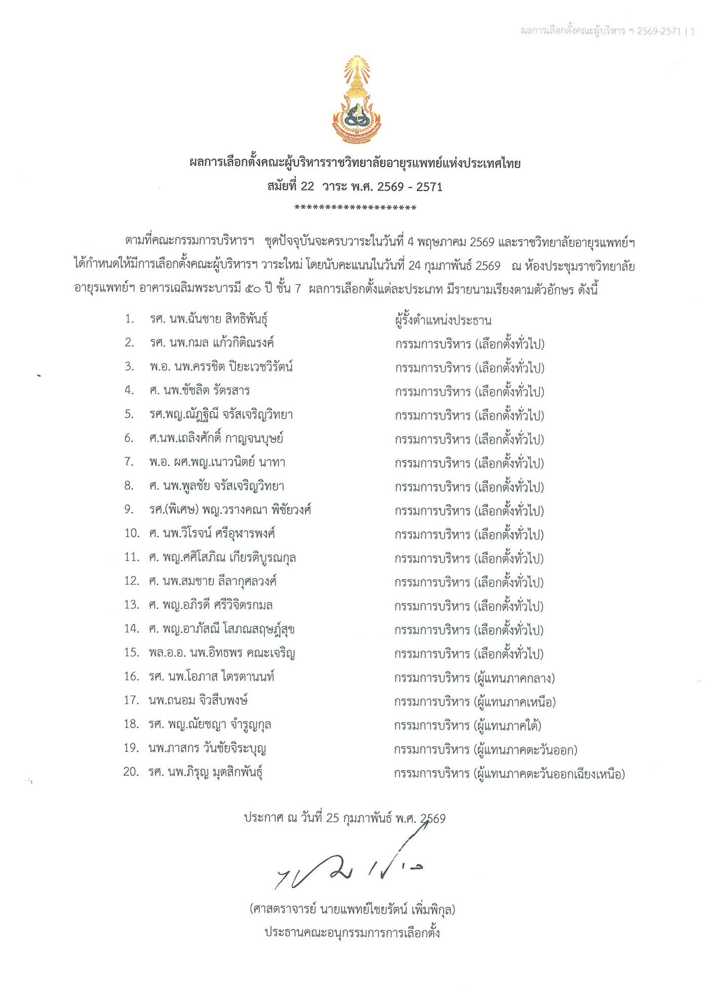 ผลการเลือกตั้งคณะผู้บริหารราชวิทยาลัยอายุรแพทย์แห่งประเทศไทย สมัยที่ 22 วาระ พ.ศ. 2569 - 2571