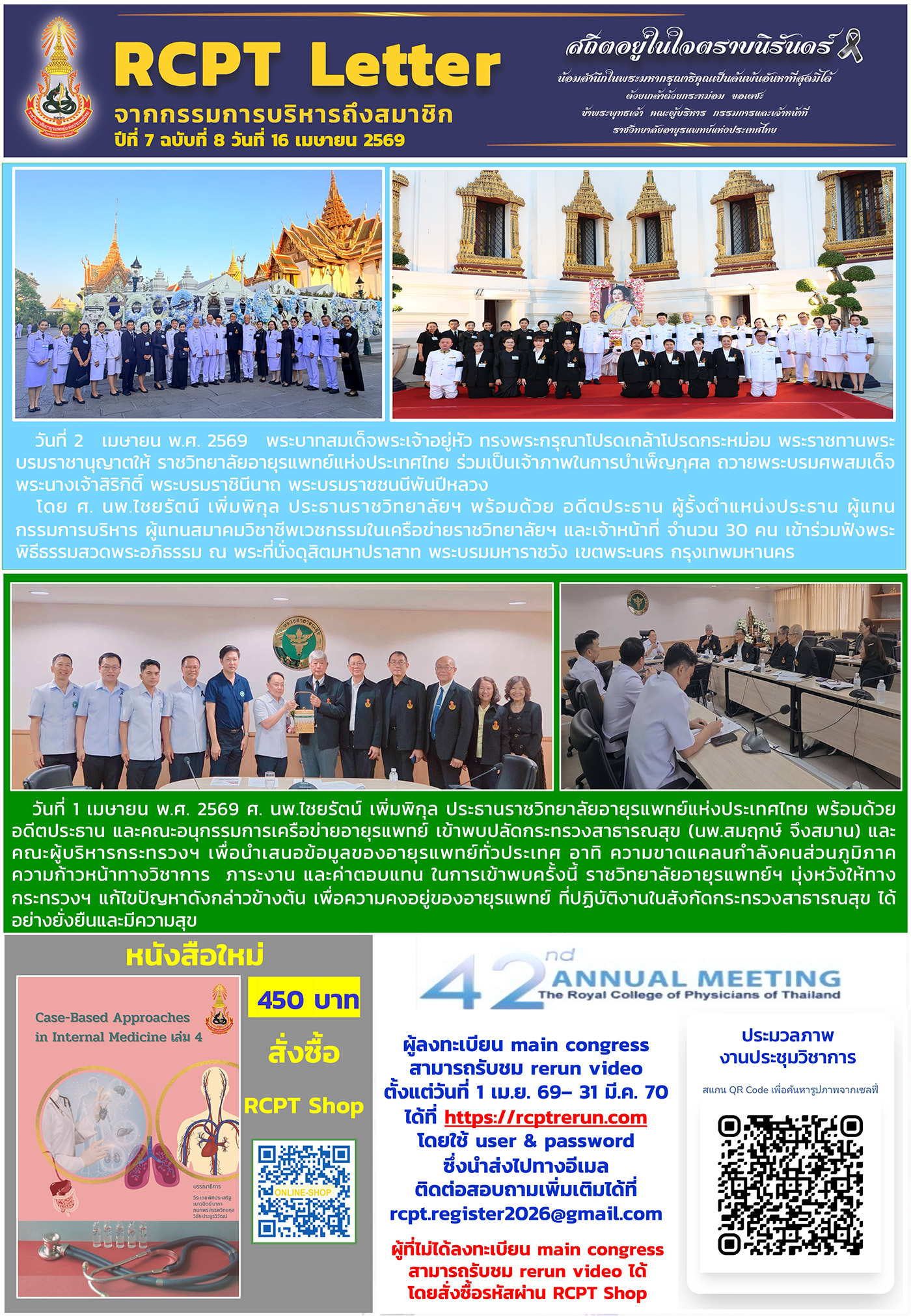 วันที่ 1 เมษายน 2569 ศ. นพ.ไชยรัตน์ เพิ่มพิกุล ประธานราชวิทยาลัยอายุรแพทย์ฯ พร้อมด้วย อดีตประธาน และคณะอนุกรรมการเครือข่ายอายุรแพทย์ เข้าพบปลัดกระทรวงสาธารณสุข (นพ.สมฤกษ์ จึงสมาน) และคณะผู้บริหารกระทรวงฯ เพื่อนำเสนอข้อมูลของอายุรแพทย์ทั่วประเทศ อาทิ ความขาดแคลนกำลังคนส่วนภูมิภาค ความก้าวหน้าทางวิชาการ ภาระงาน และค่าตอบแทน